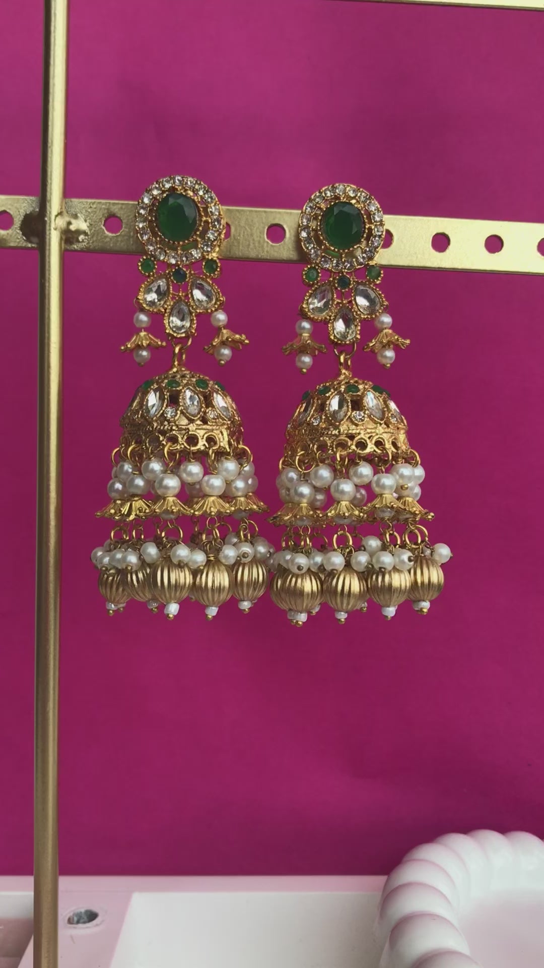 Pair the green jhumkay with yellow or gold outfits for a festive vibe, red with traditional bridal wear, and antique white with pastels or ivory for a timeless, elegant look.